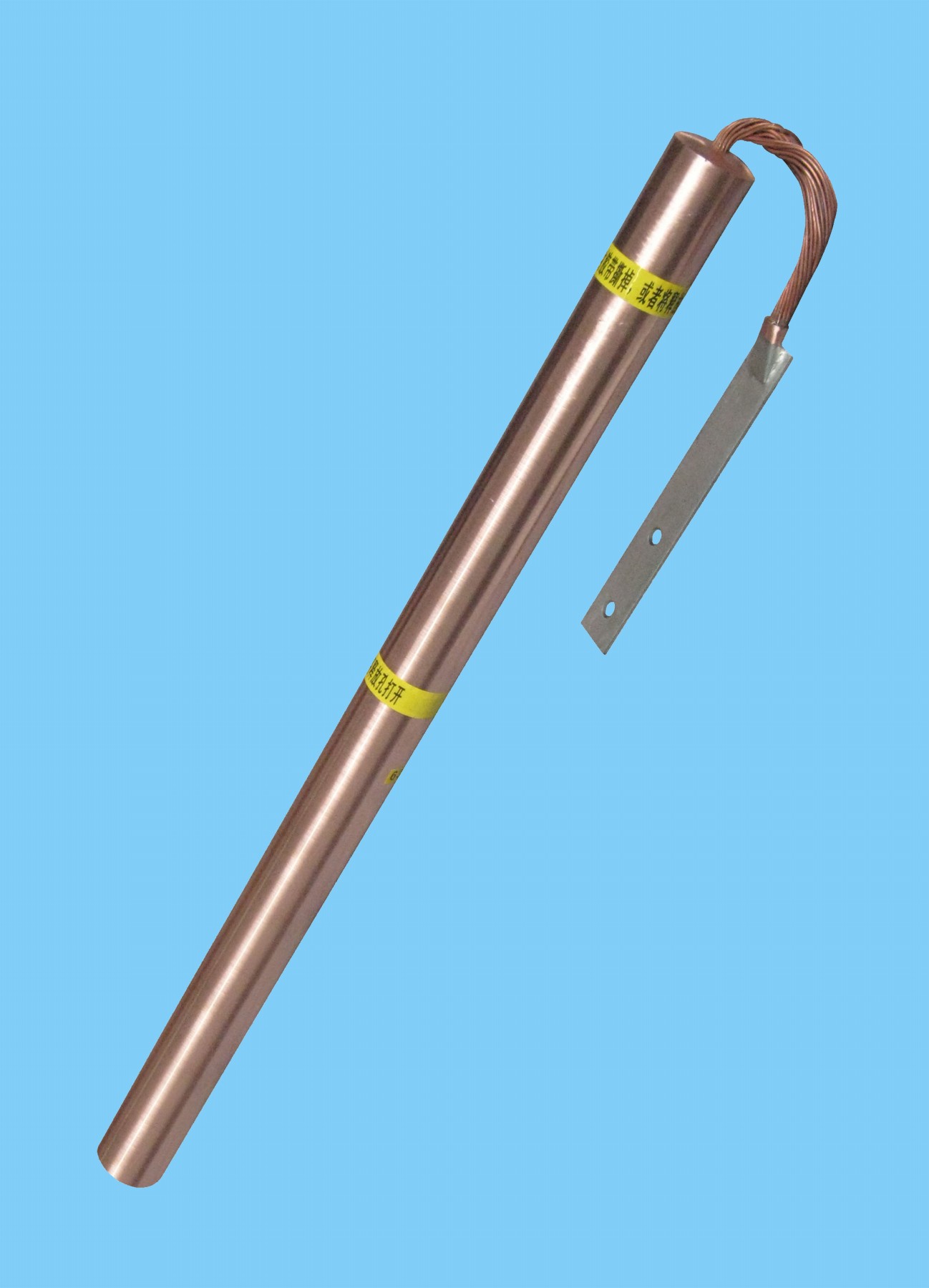 3. 將電解離子接地極從包裝中取出,檢查產(chǎn)品是否完整(電解離子接地極一端焊接了一段95mm2銅線(xiàn),銅線(xiàn)上再焊接了一塊鍍鋅扁鐵,其上開(kāi)了兩個(gè)直徑為12mm的圓孔,孔中心距為63mm)。